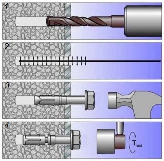 Анкер болт монтируется в монолитную поверхность таким образом: