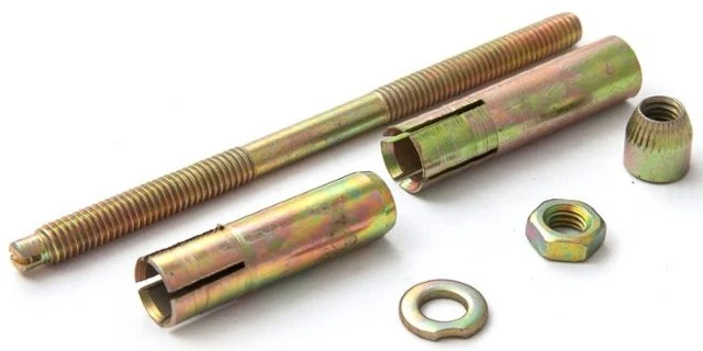 При производстве анкеров применяются латунь с углеродистой сталью, которые относятся к прочным материалам. Стальные изделия имеют дополнительную антикоррозийную защиту – белое или желтое покрытие из цинка. Рабочей частью конструкции является полая гильза с продольными разрезами по длине, которые при забивании анкера в отверстие гильзы формируют лепестки. Еще одним элементом крепежа является шпилька с регулировочной гайкой, а также шайбой.