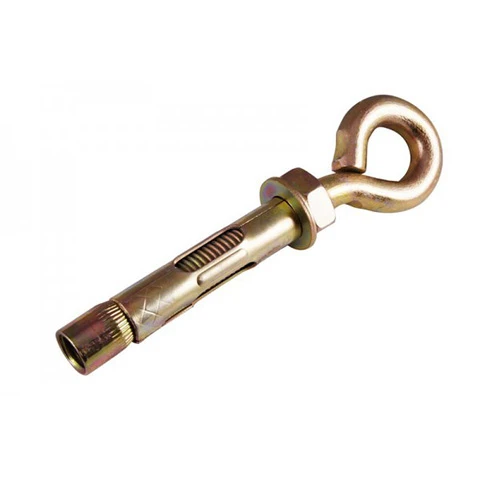 Анкер болт, как и другие распорные модели, состоит из втулки, позволяющей надежно его зафиксировать в заранее просверленном отверстии. На боковой поверхности втулка имеет продольные разрезы, позволяющие при вбивании резьбового элемента формировать отдельные лепестки, обеспечивающие надежность крепления. Один из концов этого элемента выполнен в форме конуса, а на другом располагается крепежное кольцо, способствующее удобному монтажу предметов. Использовать метиз следует при работе с твердотельными материалами, отличающимися плотной структурой. Они подойдут для бетона, натурального камня, полнотелого кирпича. В пустотелых и пористых поверхностях применение таких болтов является неэффективным.