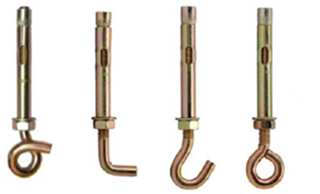 Как выглядит крюк с анкером? Изделие имеет распорную втулку, куда вставлена конусная часть. На одном из концов втулки расположены болт шайба с гайкой, а также шпилька-крюк с резьбой.