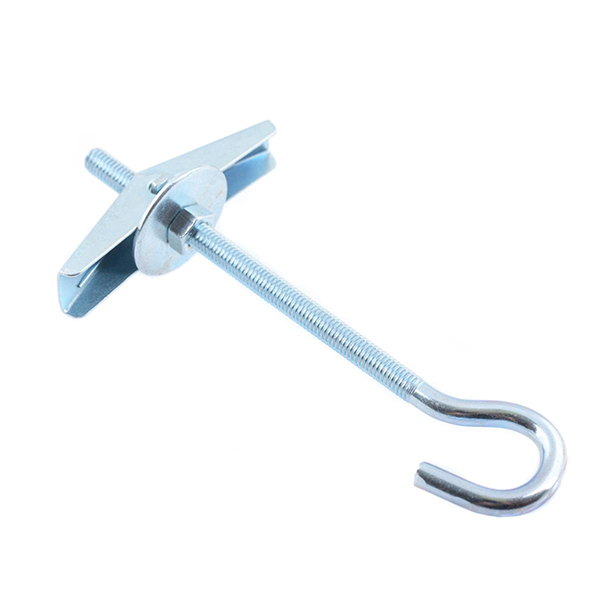 Изделие короче стандартных моделей и с одной стороны имеет стопорные складные крылья и пружинный механизм. Такая конструкция позволила определить его сферу использования. Болт складной пружинный с крюком применяют при соединении тонких листов гипсокартона, например, при создании фальшпотолка, а также при креплении нетяжелых изделий к армстронгу, гипсокартонным плитам и прочим пустотелым материалам, используемым в строительстве.