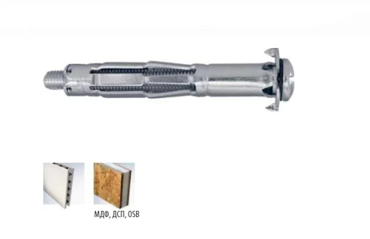 Благодаря острому металлическому наконечнику, при забивании метиза в гипсокартон, полотно не даст трещин, так как изделия рассчитаны на работу с таким материалом. Также они хорошо себя показали при креплении в фанерные стены, а также созданные из волокнистой древесной плиты. Не только установка анкера молли, но и его демонтаж отличаются простотой, что делает монтаж быстрым и удобным.