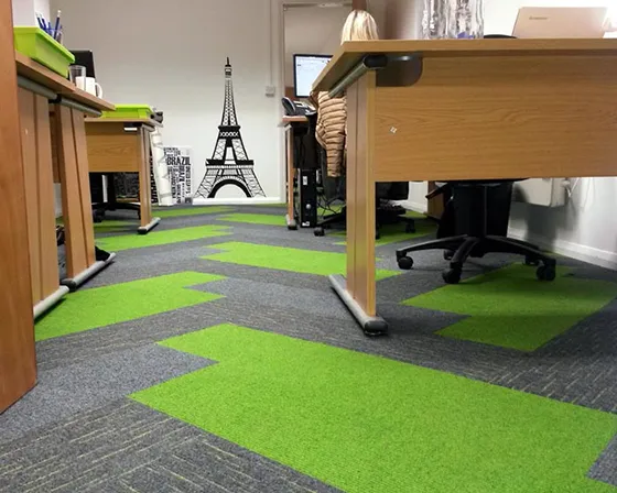 - Ковровым покрытием можно устелить всю поверхность пола, или квадратами закрыть лишь его часть. Сделайте ставку на единообразие или разнообразие. Все эти решения будут иметь свои последствия, и изменят внешний вид вашего офиса к лучшему.