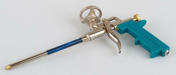 Конструкция такого прибора довольно проста, как и принцип действия. Он состоит из крепежного устройства, трубки для выпуска пены с двумя клапанами и курковым механизмом на ручке. С тыльной стороны изделия располагается механизм, которым можно регулировать выход пены. При нажатии на курок, располагающийся в подающей трубке, двойной клапан открывается и пена из баллона проходит внутрь этой трубки.