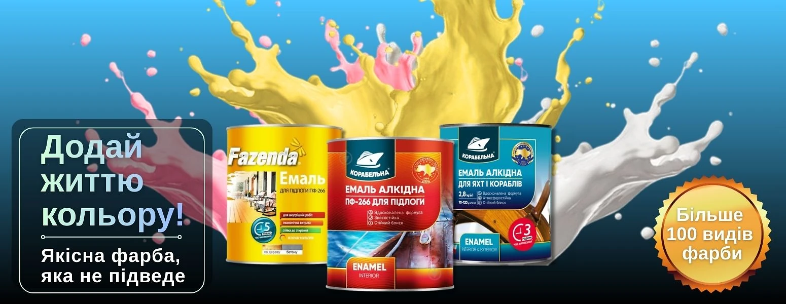 - Категорія "Фарби та лаки" включає: фарби емалі ПФ-115, водоемульсійні фарби, ґрунтовки по дереву й металу, а також розчинники для них.