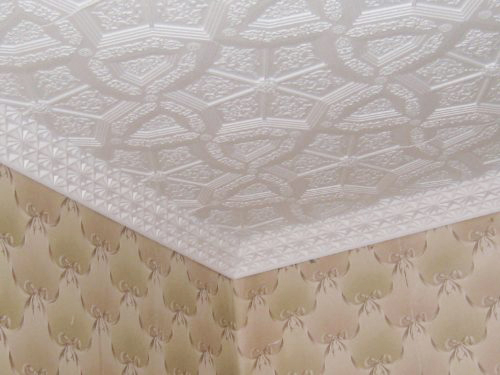 - Штампована (пресована). Така плитка виробляється методом пресування. Пінопласт стискається в спеціальних формах. Особливість такого методу - невелика товщина готової плитки (до 8 мм), А сама плитка виходить крихкою. Хоч вона й має невисоку вартість, така плитка володіє непоганими властивостями тепло і звукоізоляції, та успішно приховує нерівності стелі. Для додаткового захисту її поверхні від забруднення використовують водоемульсійну фарбу. Популярна через свою ціну.